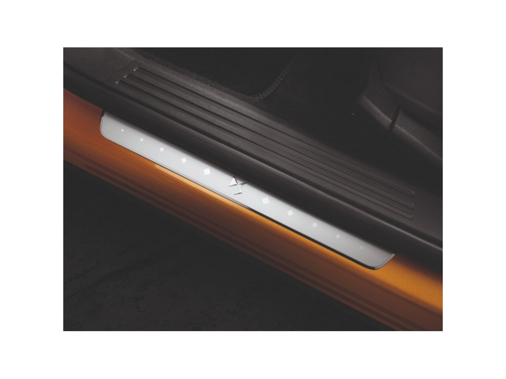 - Set of 4 front and rear door sill trim strips, aluminium look with "DS" marking.